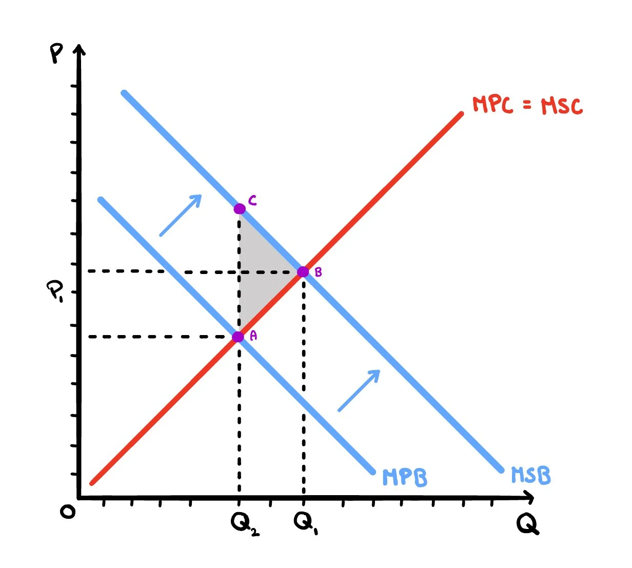 To correct this, governments can intervene through subsidies, public provision, or awareness campaigns to encourage greater consumption and bring the economy closer to the socially optimal level.