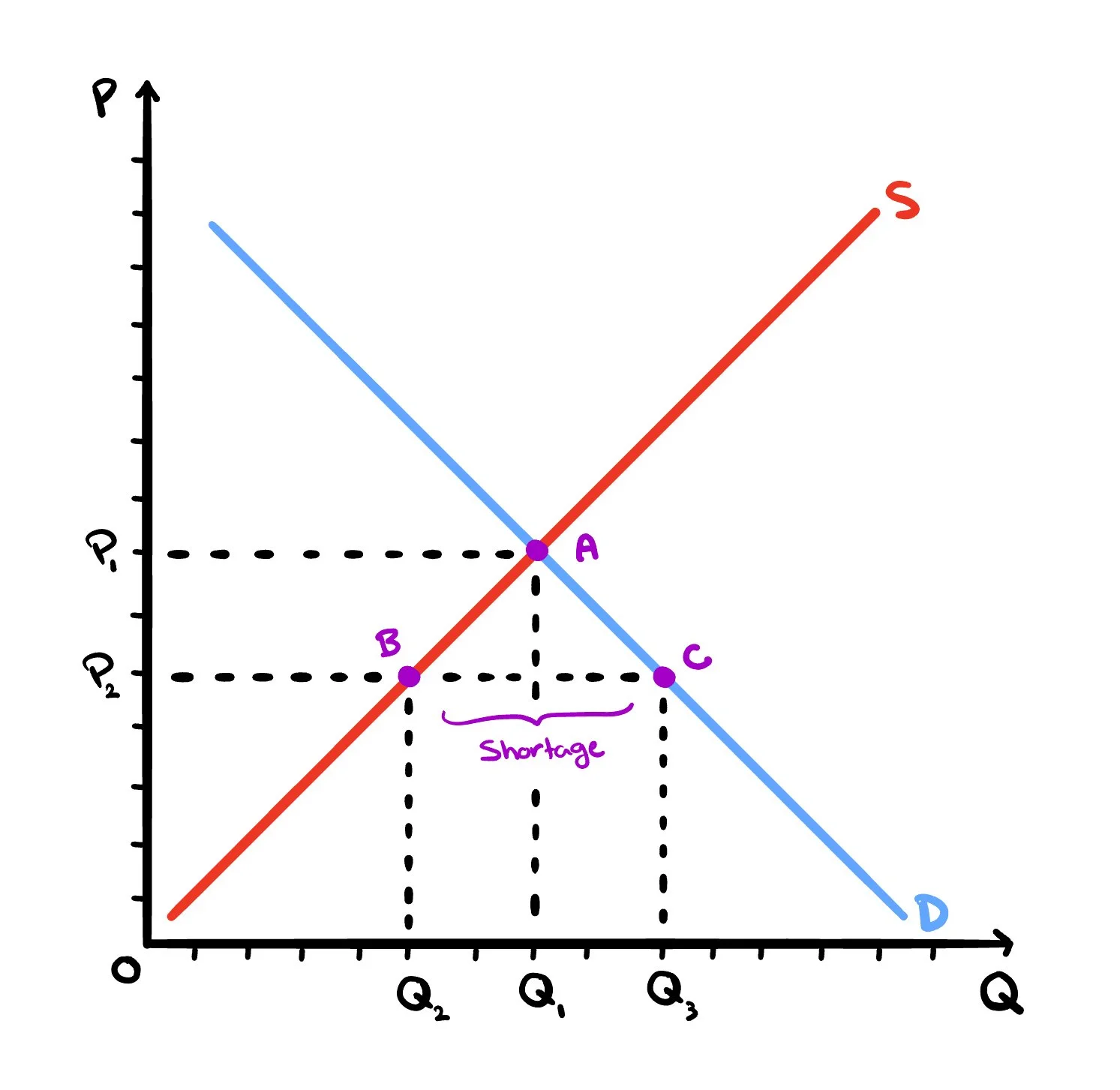 The graph above illustrates a market shortage, which arises when the price is set below equilibrium. At the lower price P2, consumers are willing to purchase a large quantity Q3, but producers are only willing to supply a smaller quantity Q2, creating an unmet demand between these two levels. This gap—marked between points B and C—represents the shortage, where there is more being demanded than supplied. Shortages typically occur due to price ceilings, sudden spikes in consumer demand, or supply disruptions, all of which prevent the market from clearing. Because many buyers are competing for a limited quantity of goods, upward pressure builds on the price, incentivizing producers to supply more and gradually driving the market back toward equilibrium at point A, where quantity demanded and supplied align at price P1 and quantity Q1.
