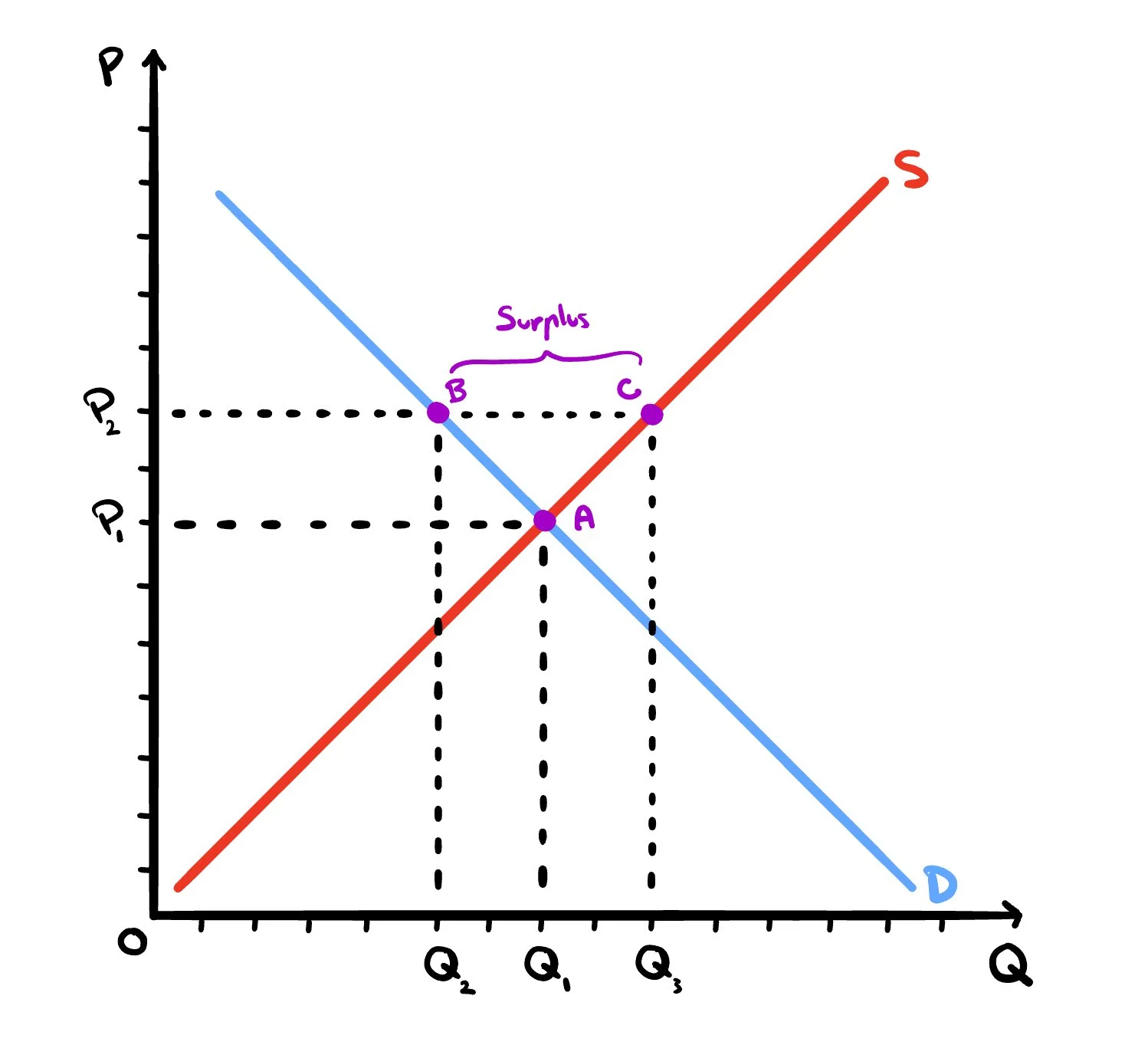 The graph above illustrates a market surplus, which occurs when the price is set above equilibrium. At price P2, suppliers are willing to produce and sell quantity Q3, while consumers are only willing to purchase quantity Q2, leaving the gap between these two quantities—marked by points C and B—as unsold goods. This mismatch reflects the surplus: too much is being supplied and not enough is being demanded. Surpluses typically emerge when prices are kept artificially high, such as through minimum price policies or overestimation of consumer demand. Since unsold goods build up and sellers are unable to clear the market, competitive pressure usually drives the price downward. This self-correcting mechanism gradually brings the market back to equilibrium at point A, where supply and demand meet at price P1 and quantity Q1.