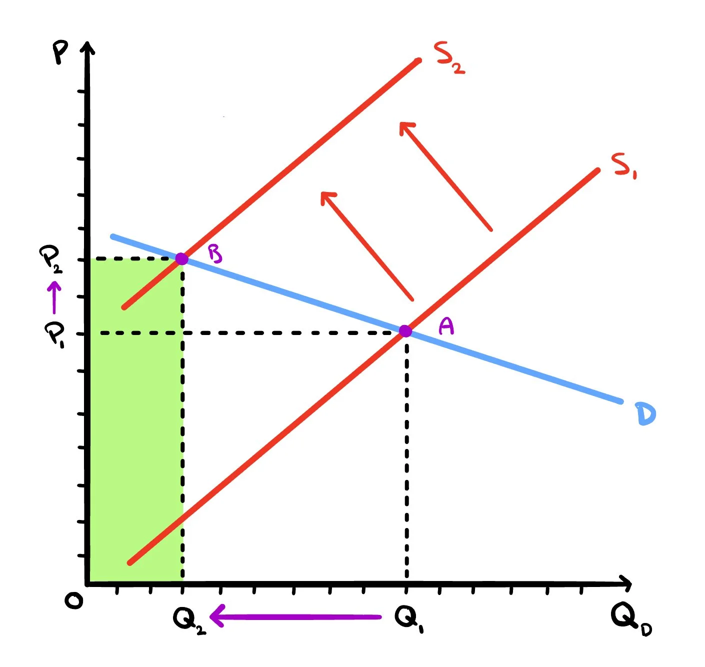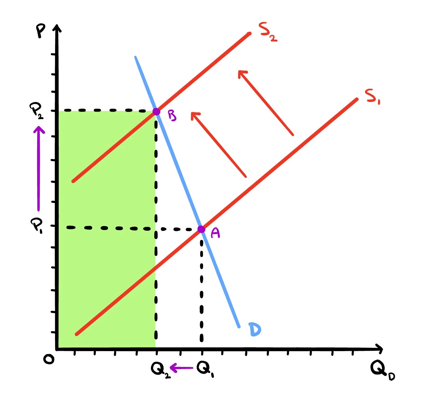 These two graphs compare the effect of a price increase on total revenue under elastic and inelastic demand conditions. In both diagrams, the supply curve shifts leftward from S₁ to S₂, causing the price to rise from P₁ to P₂ and the quantity to fall from Q₁ to Q₂. However, the impact on total revenue—represented by the green shaded rectangles—differs significantly depending on the shape of the demand curve. This comparison is a classic application of price elasticity of demand: how total revenue responds to price changes depends entirely on consumer sensitivity.